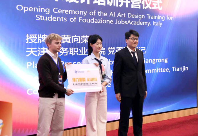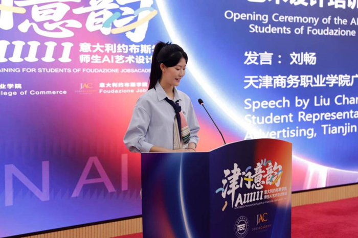 两校学生代表也分享了对培训的期待。天津商务职业学院广告学院学生刘畅阐述了自己的创作理念,她将 AI 视为创作伙伴,期待在培训中探索中国水墨风格与意大利油画风格的融合路径,让两国文化在艺术作品中实现深度对话;意大利约布斯学院学生劳拉则表达了激动的心情:“能来到天津学习人工智能艺术设计,我既感到荣幸,又充满期待。希望通过此次交流,深入了解中国师生对人工智能的认知与应用思路,探讨 AI 在现实生活中的多元应用场景,在互学互鉴中积累经验、碰撞思想,最终创作出令人惊艳的作品。”