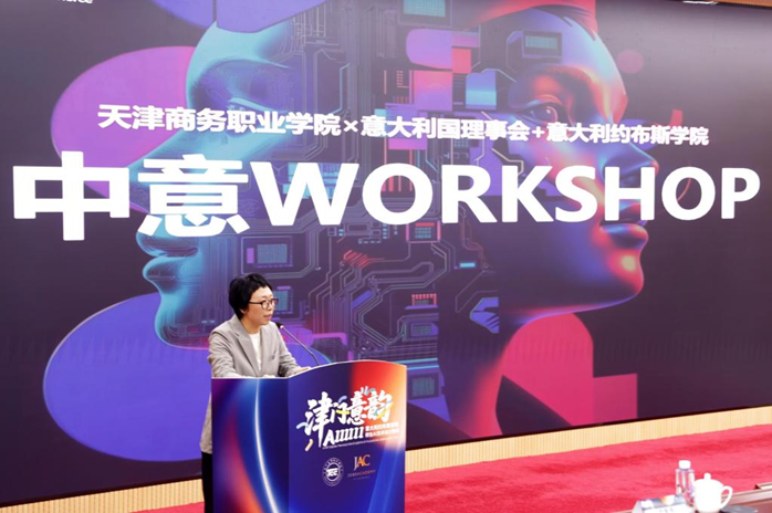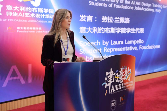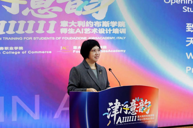 意大利约布斯学院国际部主任玛利亚・格拉齐亚・布拉蒂女士在发言中,向天津商务职业学院及为培训筹备付出辛勤劳动的全体工作人员致以诚挚感谢。她高度评价两校合作的高效性与务实性,希望参训学员不仅要学习 AI 艺术设计的相关技巧,更要学习如何让人工智能真正成为创作中的得力助手,祝愿学员们在交流中收获新知与技能,在体验中开阔眼界、感受多元文化、建立起深厚的跨国友谊。